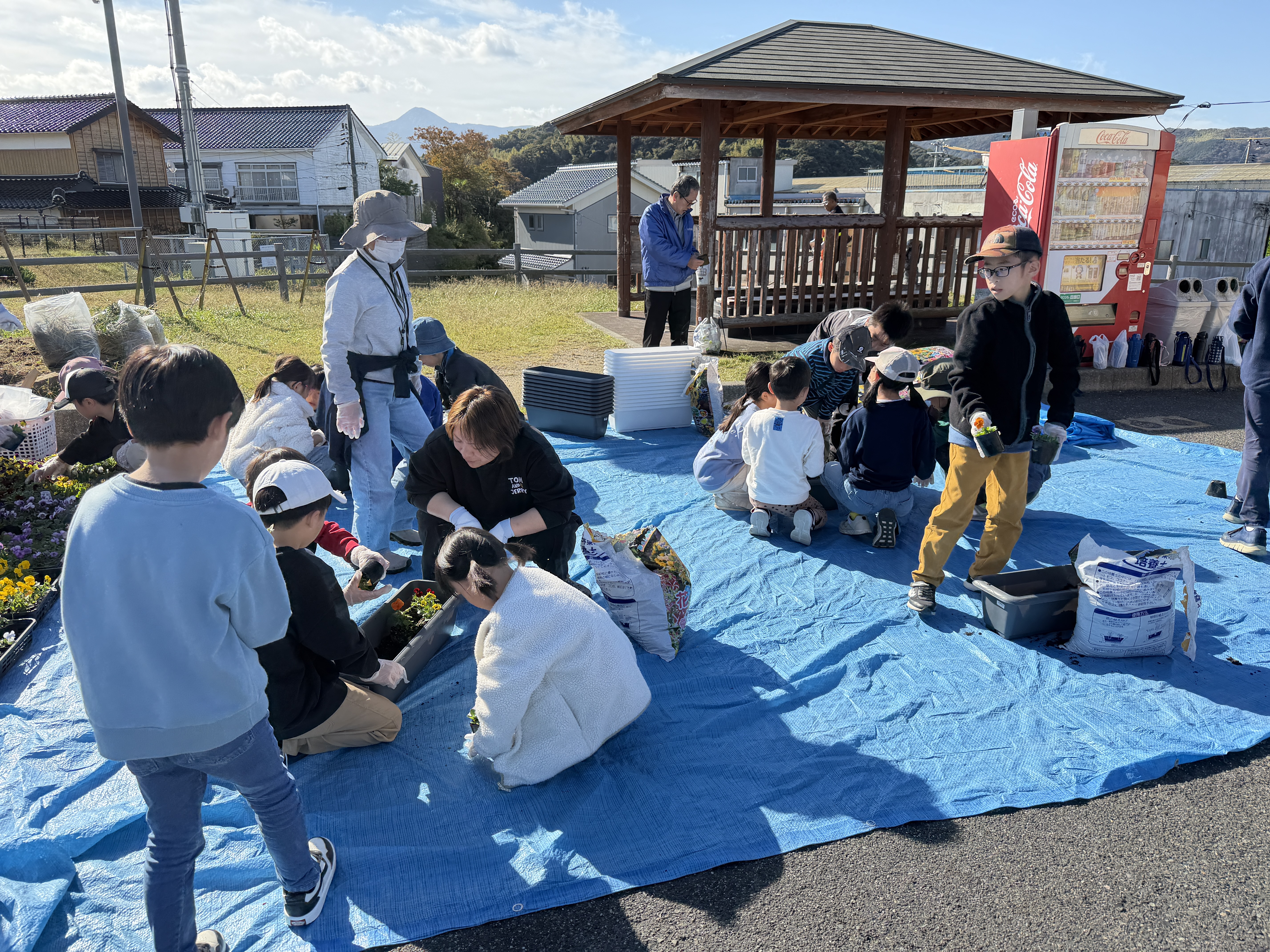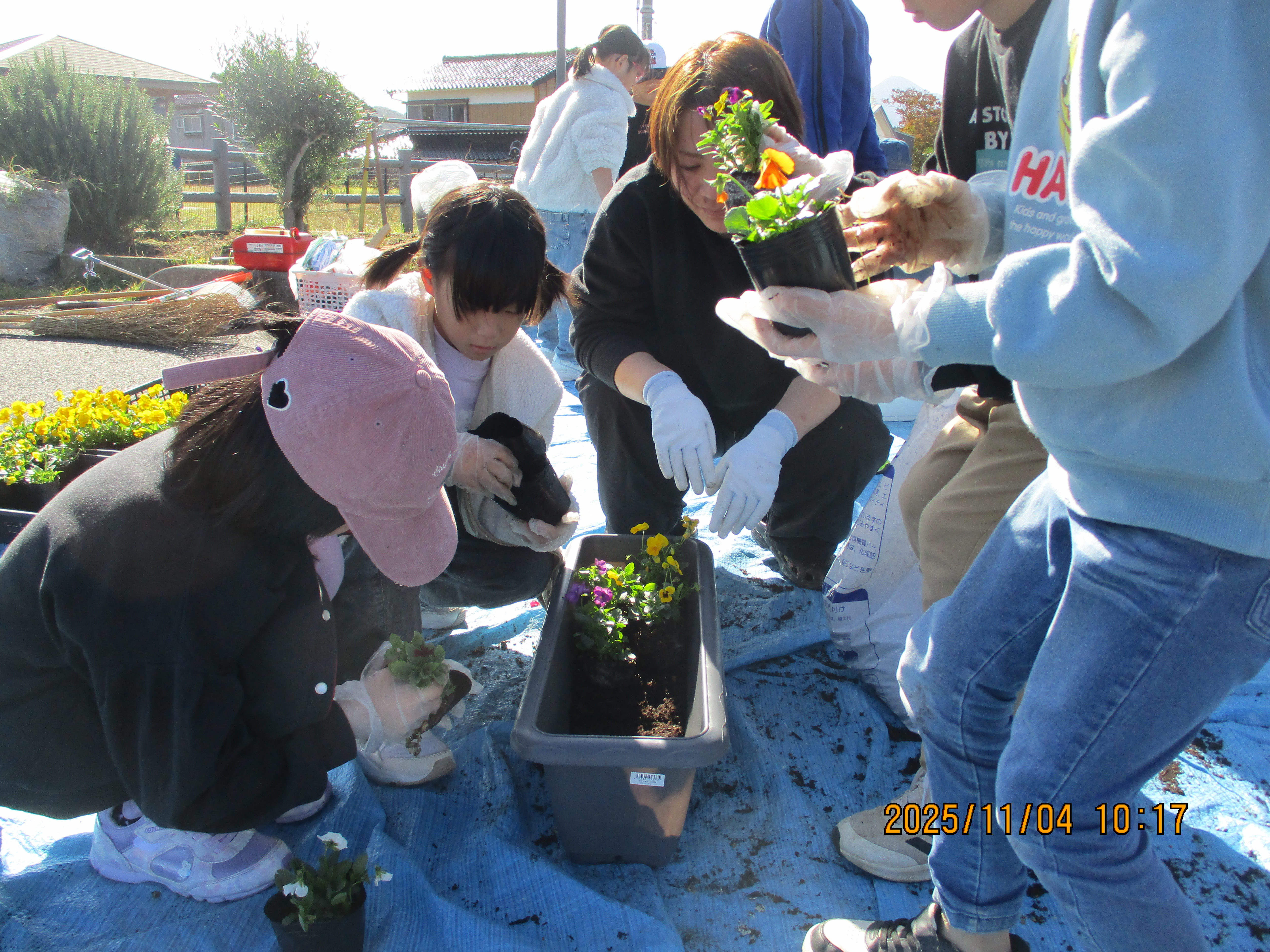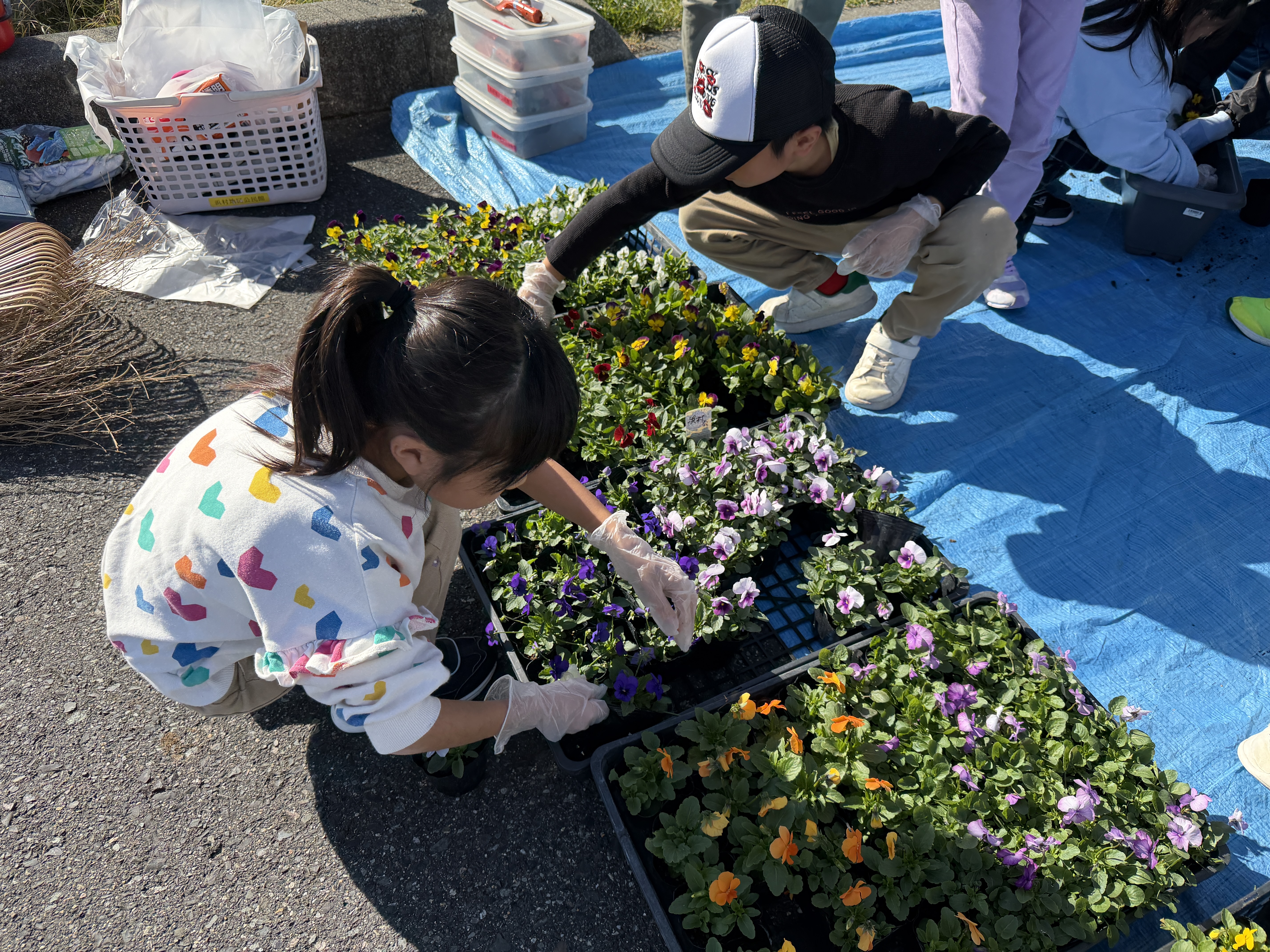 11月4日(火) 緑の募金事業 やってみようデー!(体験的学習等休業日)を利用して、放課後児童クラブの生徒達と花植えをしました。みんなが普段からよく利用しているヤサホーパークを花を植えて綺麗にしようという事業です。30個のプランターに、せっせかと植えて短時間で作業が終了しました(^^)この日は、晴れ渡る晴天だったこともあり、カラフルな花の色がよく映えていました。放課後児童クラブのみなさんありがとうございました。