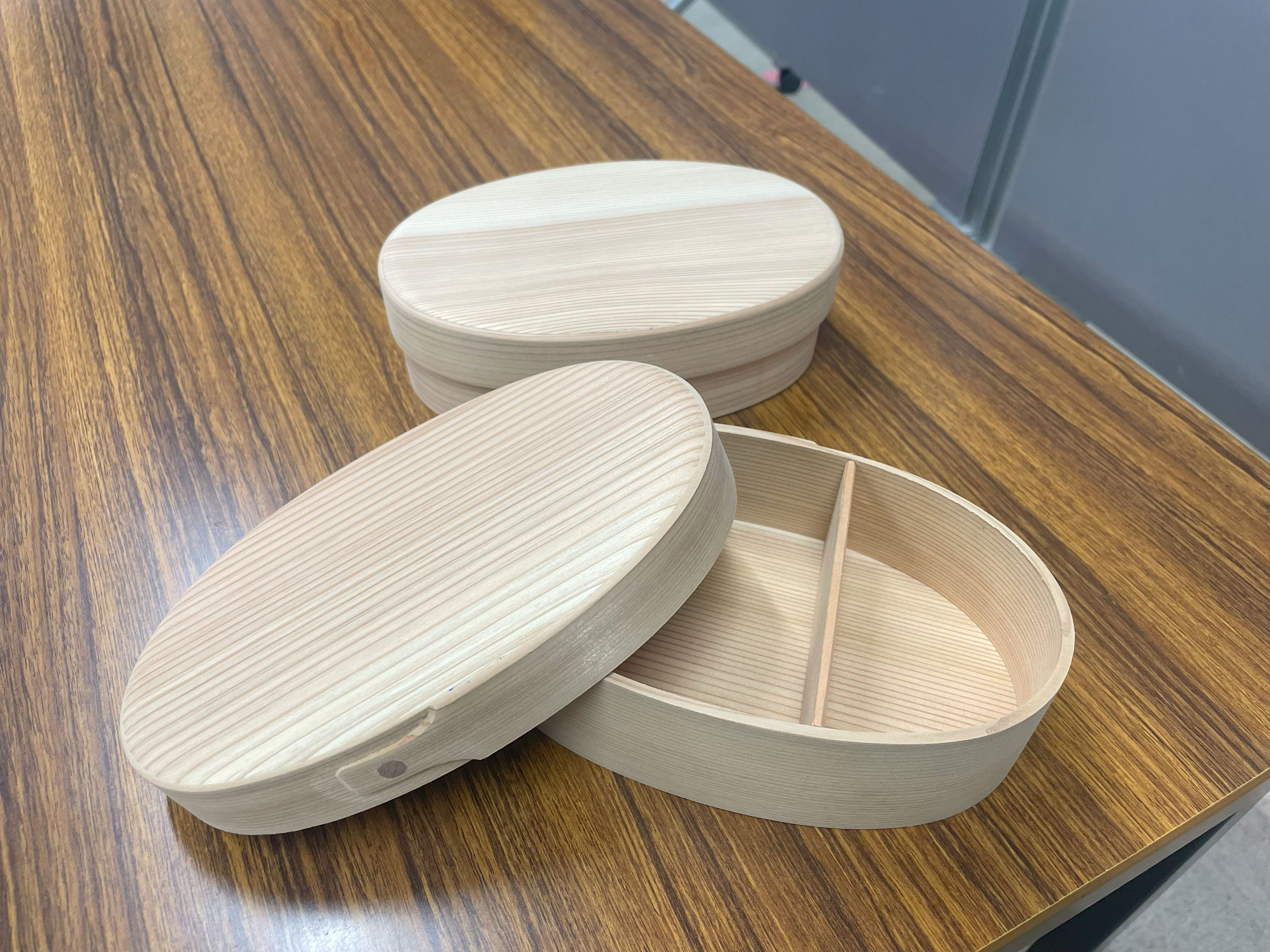 参加者:9名智頭農林高校の天川先生を講師に迎え、曲げわっぱ作り体験を行いました。木材を煮て柔らかくしたものを曲げ、よく乾燥して曲げわっぱは作られるそうです。手作りの曲げわっぱは、木のいい匂いがして暖かみのあるお弁当になりました(^^)