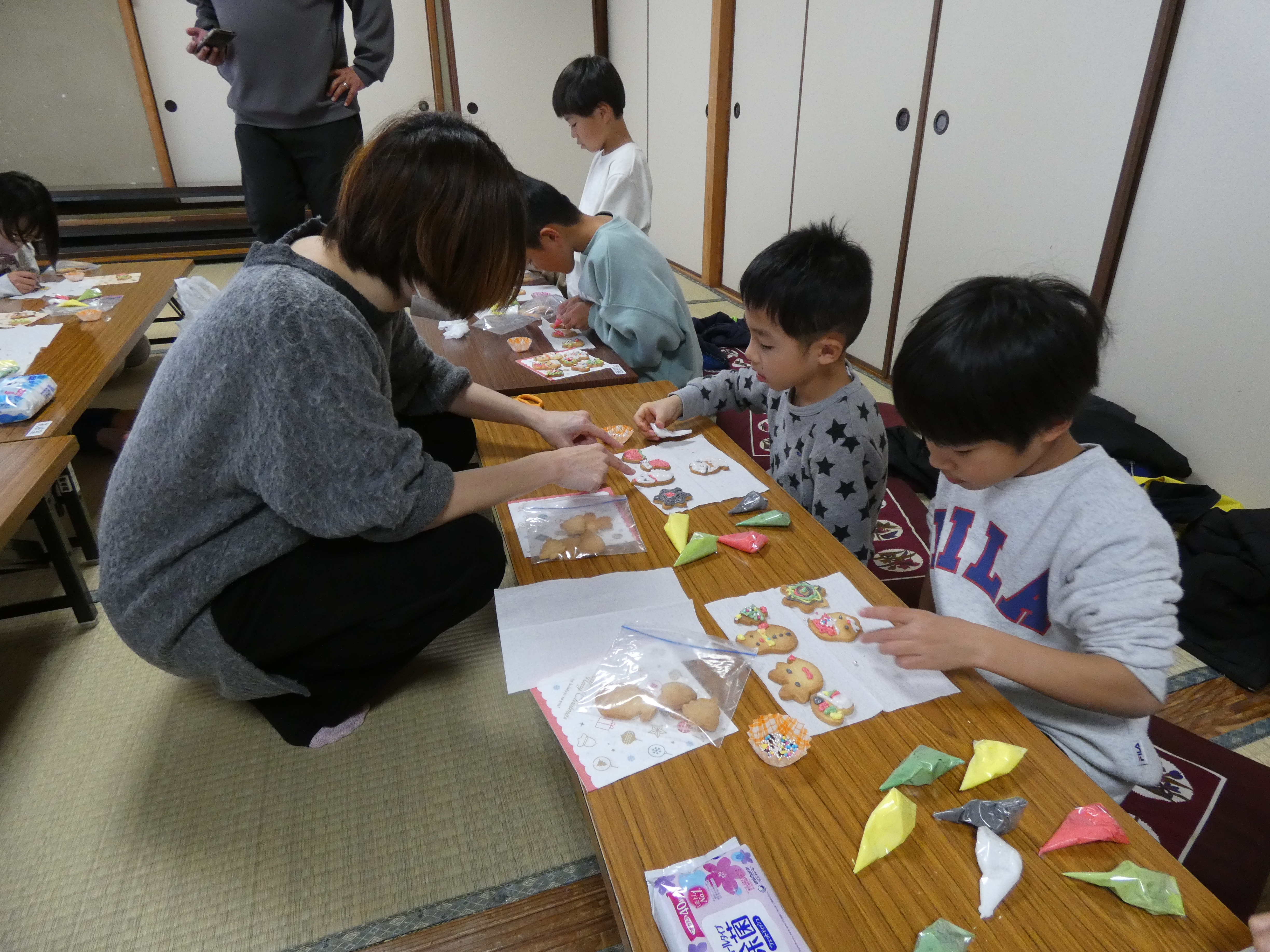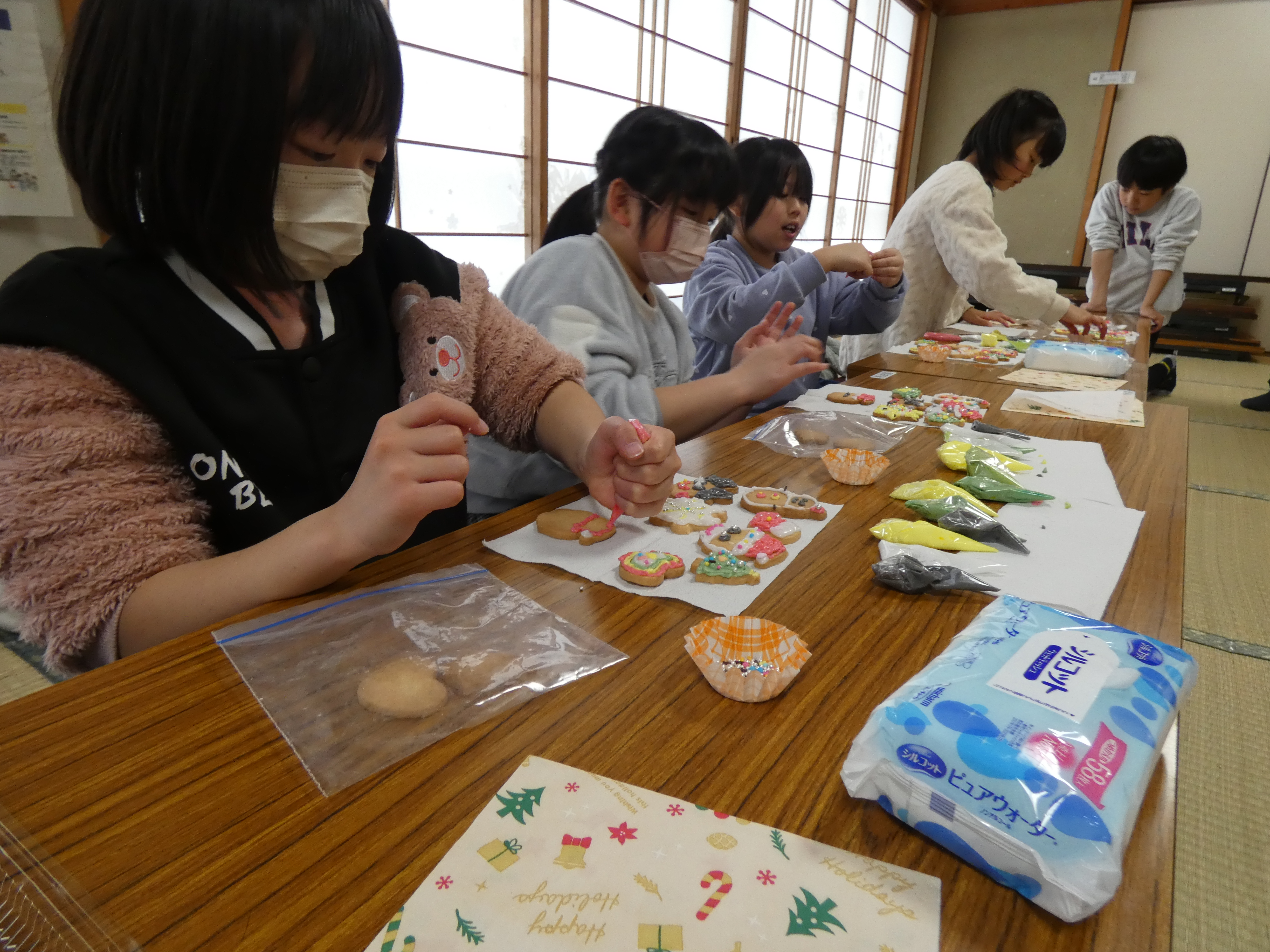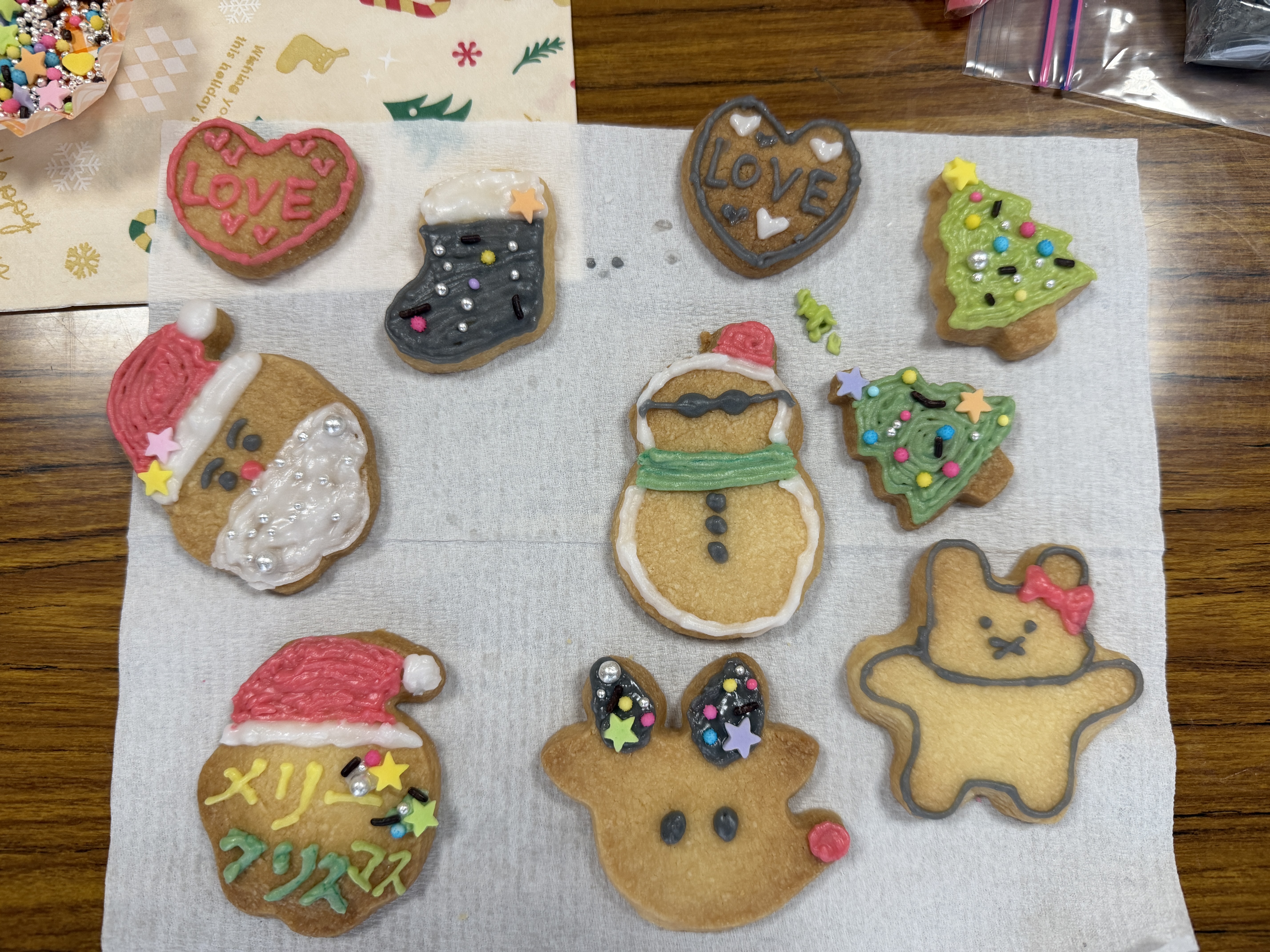 小学生と一緒にアイシングクッキーづくりに挑戦しました。クリスマスを1日過ぎてしまいましたが、サンタやトナカイの形をしたクッキーに、粉糖を使ってみんなが上手に絵をかいていました。見た目も可愛く味も美味しいクッキーができあがりました(^^)