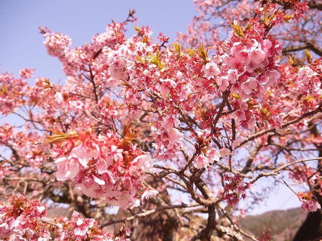 日置谷の寒桜は、例年1月下旬ごろよりぽつぽつと咲き始め、2月中旬ごろに満開となります。