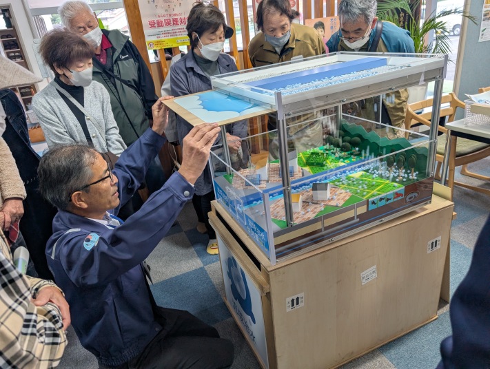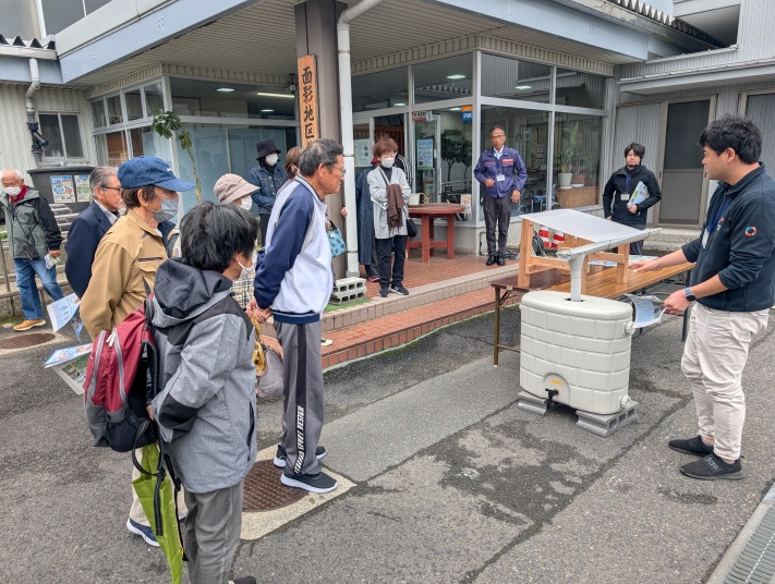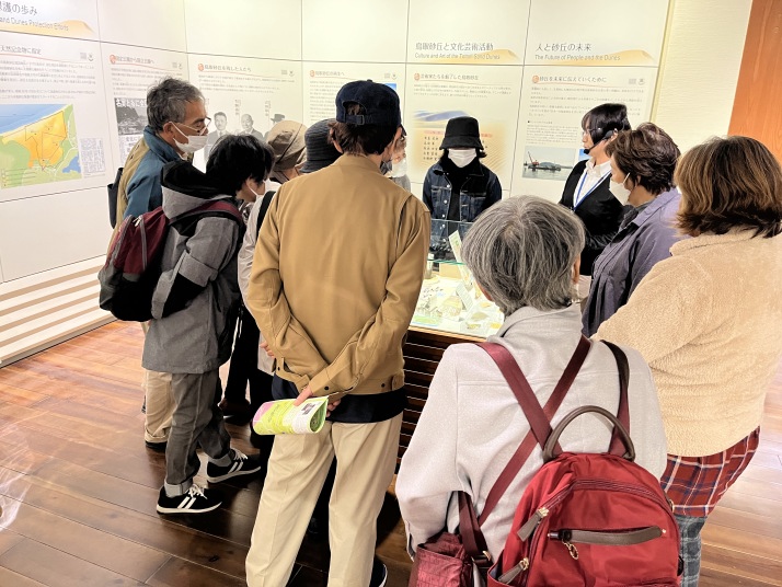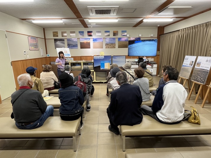1.面影地区公民館 雨水貯留タンクの説明見学 2.鳥取地方気象台 施設の見学・説明 3.砂丘ビジターセンターにて砂丘についての説明、見学 |