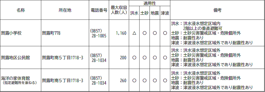 | 海洋の家体育館 | 鳥取市賀露町南5丁目1718-3 | 指定緊急避難場所 ・指定避難所 |