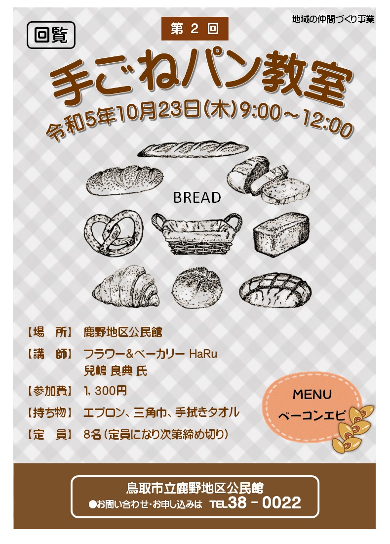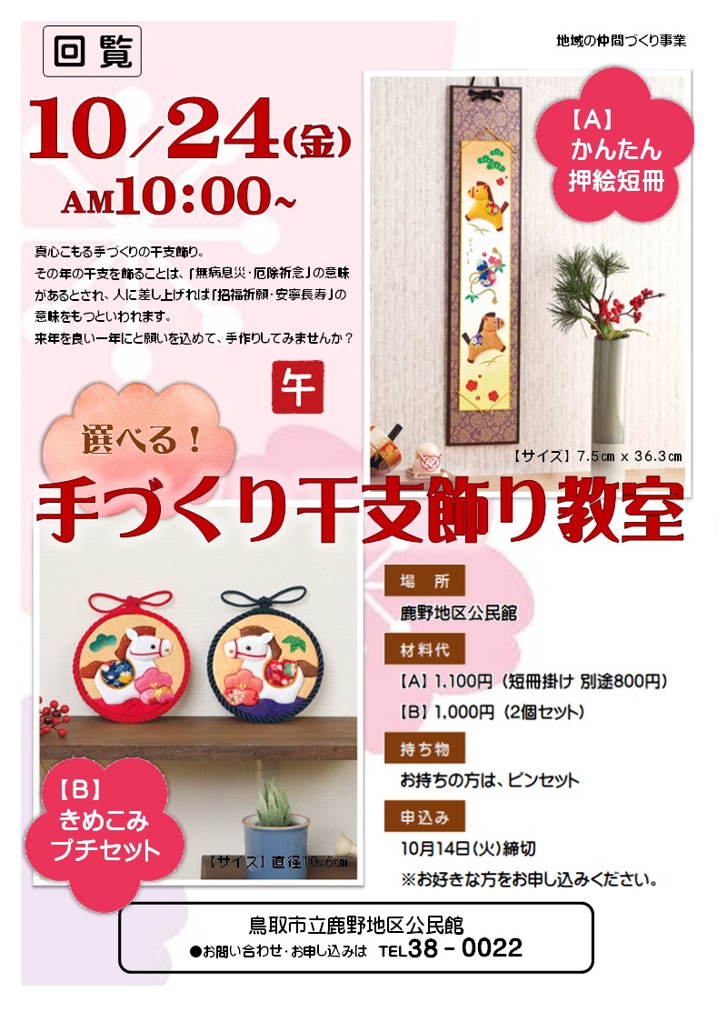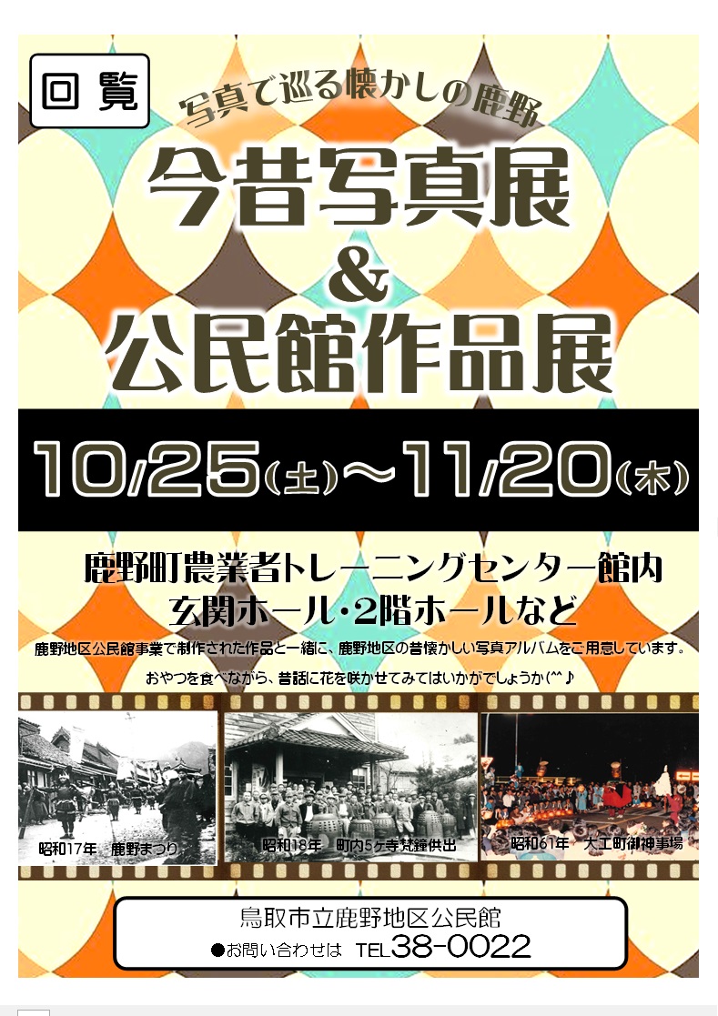 10月8日(水) 9:00~ 健康マージャン 10月10日(金) 9:30~ 機能改善健康教室 10月15日(水) 9:00~ 健康マージャン 10月17日(金) 10:00~11:30 健康ゲーム体験会 10月20日(月) 9:30~ しゃんしゃん体操教室 10月21日(火) 8:20集合:鹿野町総合支所駐車場 第3回 鹿野学講座「歴史探訪~松江~」 *定員に達しました。 10月22日(水) 9:00~ 健康マージャン 10月23日(木) 9:00~ 手ごねパン教室-ベーコンエピ- *定員に達しました。 10月24日(金) 10:00~ 手づくり干支飾り教室 10月25日(土)~11月20日(木)まで 今昔写真展&公民館作品展 10月29日(水) 9:00~ 健康マージャン 11月5日(水) 9:00~ 健康マージャン 11月9日(日) 9:00~ 鹿野学園流沙川学舎発着 鷲峯山麓ハーフマラソン大会 11月12日(水) 9:00~ 健康マージャン 11月14日(金) 9:30~ 機能改善健康教室 11月14日(金) 13:30~ 鹿野学園環境整備事業 ~王舎城学舎~ 11月17日(月) 9:30~ しゃんしゃん体操教室 11月19日(水) 9:00~ 健康マージャン 11月26日(水) 9:00~ 健康マージャン |
