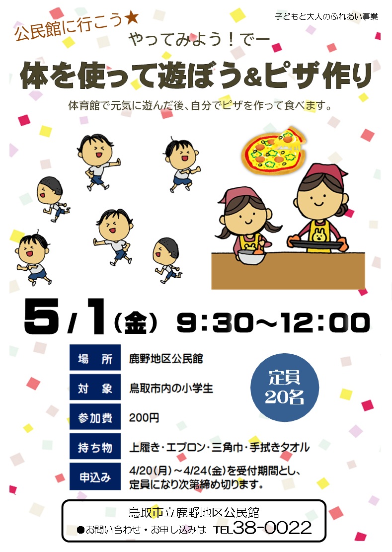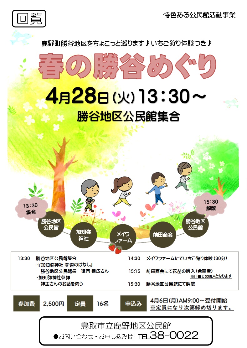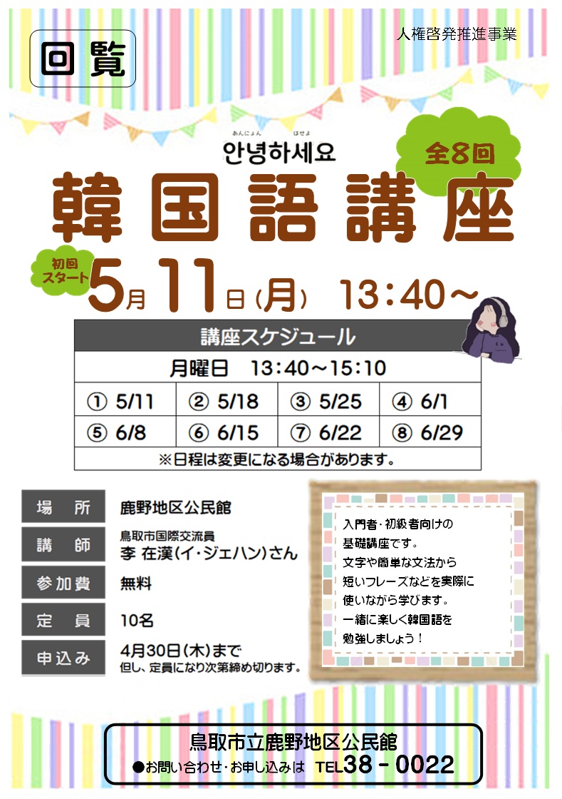 4月7日(火) 9:00~ 健康マージャン 4月10日(金) 9:30~ 機能改善健康教室 4月13日(月) 9:30~ しゃんしゃん体操教室 4月14日(火) 9:00~ 健康マージャン 4月21日(火) 9:00~ 健康マージャン 4月28日(火) 9:00~ 健康マージャン 4月28日(火) 13:30~ 勝谷地区公民館集合 春の勝谷めぐり 5月1日(金) 9:30~ やってみよう!でー(小学生対象) 体を使って遊ぼう&ピザ作り 5月11日(月) 13:40~ 第1回 韓国語講座 5月12日(火) 9:00~ 健康マージャン 5月18日(月) 13:40~ 第2回 韓国語講座 5月19日(火) 9:00~ 健康マージャン 5月25日(月) 13:40~ 第3回 韓国語講座 5月26日(火) 9:00~ 健康マージャン |