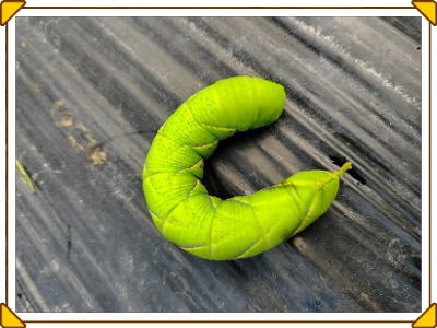 ⦿ネットで検索してみたら、【スズメガ】の幼虫でした。茄子の葉っぱを食べるんだそうです。