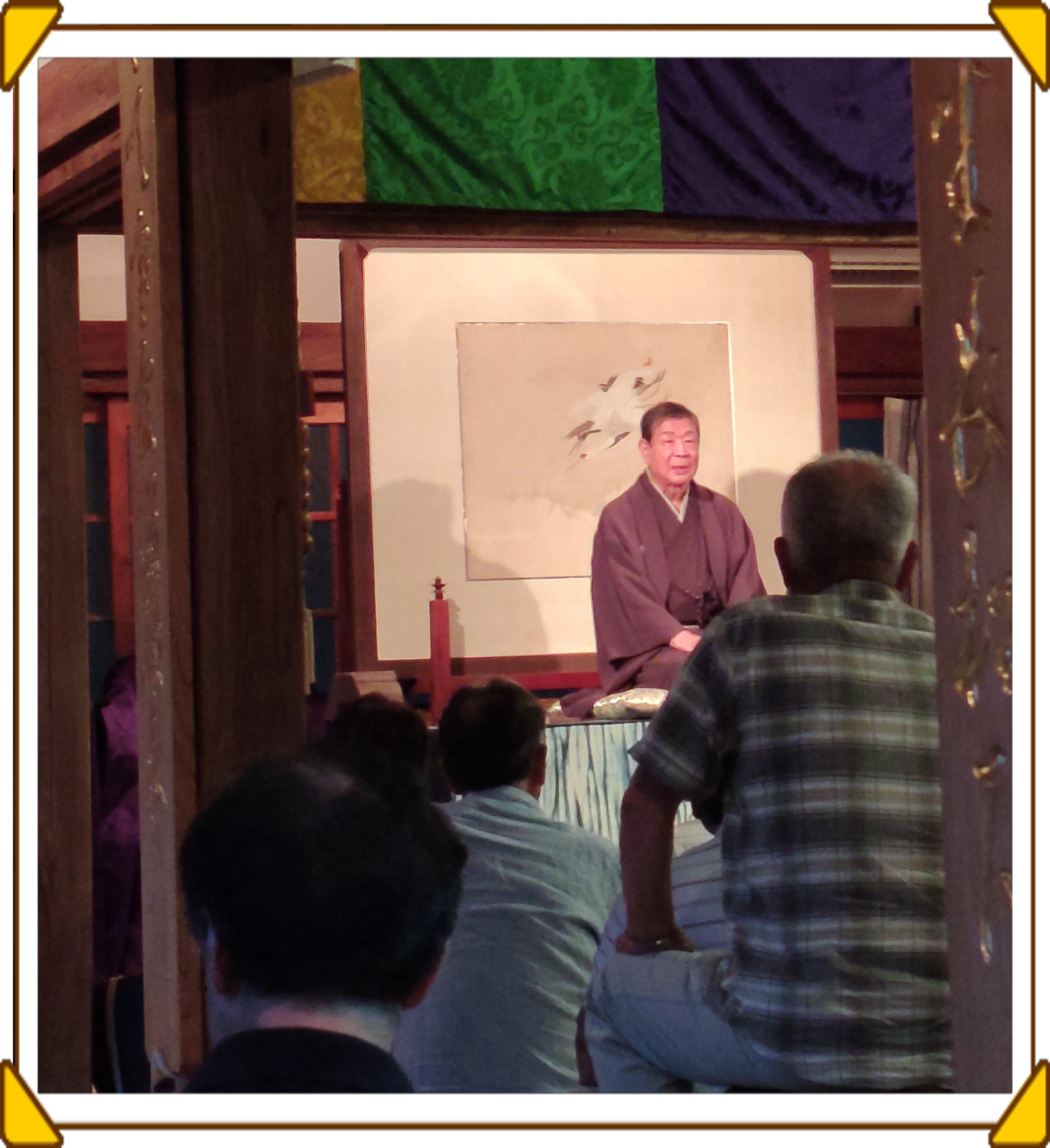 ⦿9月22日(月)に雲龍寺本堂で、午後6時から開催されました。この日は庭園がライトアップされ、愛宕山の上に浮かぶ月を鑑賞しながら落語を楽しみました。当日は、100人近くの観客が来られました。