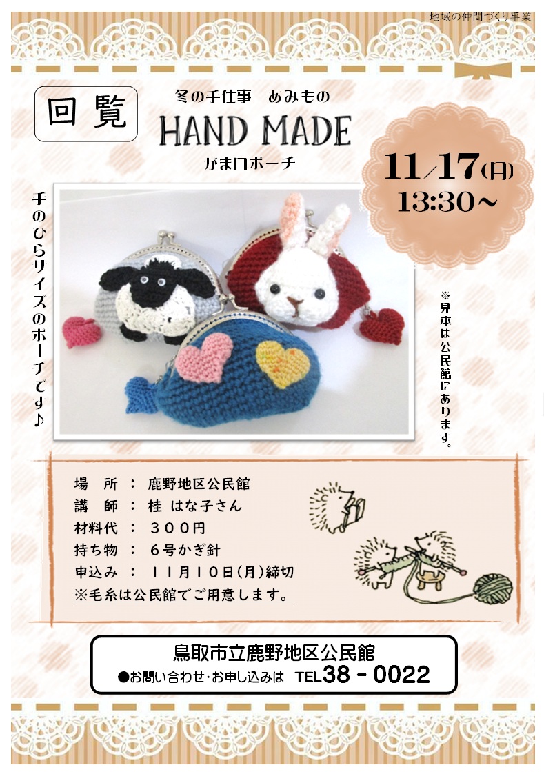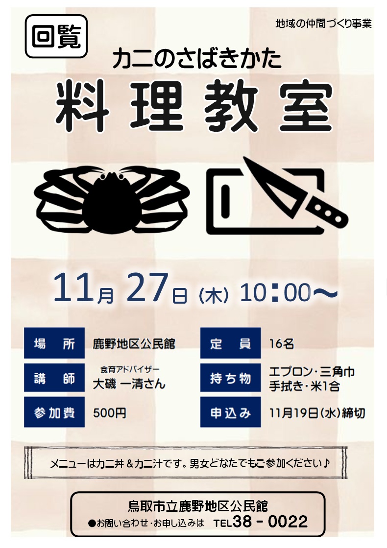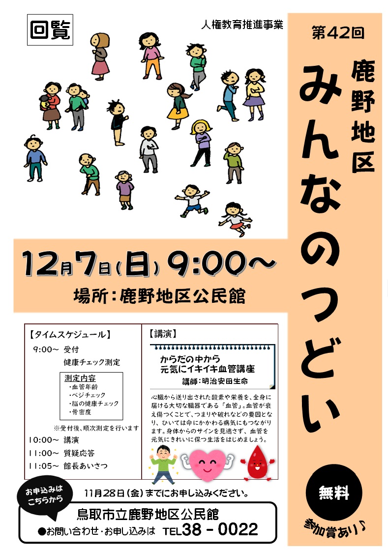10月25日(土)~11月20日(木)まで 今昔写真展&公民館作品展 11月9日(日) 9:00~ 鹿野学園流沙川学舎 発着 鷲峯山麓ハーフマラソン大会 11月12日(水) 9:00~ 健康マージャン 11月14日(金) 9:30~ 機能改善健康教室 11月14日(金) 13:30~ 鹿野学園環境整備事業 ~王舎城学舎~ 11月17日(月) 9:30~ しゃんしゃん体操教室 11月17日(月) 13:30~ 編み物教室~がま口ポーチ~ 11月19日(水) 9:00~ 健康マージャン 11月26日(水) 9:00~ 健康マージャン 11月27日(木) 10:00~ 料理教室~かに料理~ 12月3日(水) 9:00~ 健康マージャン 12月7日(日) 9:00~ 第42回 みんなのつどい 健康チェック(血管年齢・ベジチェック・骨密度)& 「からだの中から元気にイキイキ血管講座」 12月8日(月) 9:30~ しゃんしゃん体操教室 12月10日(水) 9:00~ 健康マージャン 12月12日(金) 9:30~ 機能改善健康教室 12月17日(水) 9:00~ 健康マージャン 12月24日(水) 9:00~ 健康マージャン |