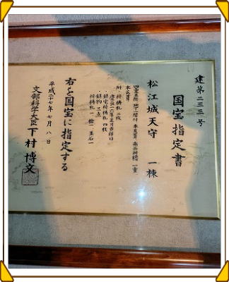 ⦿松江城の見どころは、①.望楼…360℃展望できます。②.鯱…木彫り銅板張り、向かって左が雄で右が雌です。現存では、最大です。③.入母屋破風 ④.懸魚 などです。内部も興味深いものがたくさんありました。最上階5階から、殿さまになった気分で松江市内を眺めました。