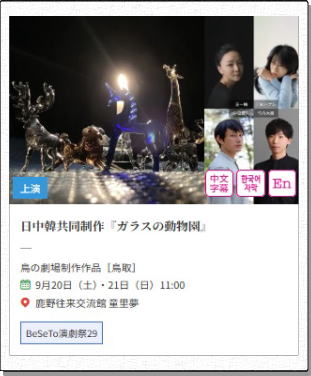 ⦿【BeSeTo演劇祭】…日本・中国・韓国の三か国の演劇人の連携により、1994年以来毎年持ち回りで開催する演劇祭です。BeSeToのBeは北京から、Seはソウル、Toは東京から取られました。今は鳥取を日本の主開催地としていますので、最後のToは鳥取のToです。