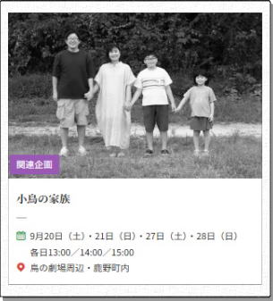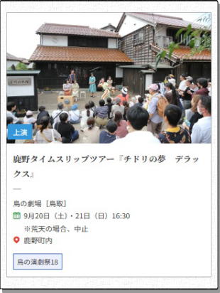 ⦿【鳥の演劇祭】…2008年から毎年開催してきた国際演劇祭です。鹿野町の鳥の劇場を中心に、町内近隣にも仮設劇場を設け、城下町地域全体で展開します。国内外の優れた現代演劇だけでなく、障がいのある人も参加する作品、親子で楽しめる作品など多様な作品を紹介してきました。
