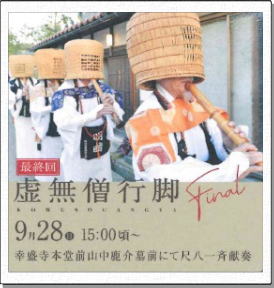 ⦿2001年秋に、全国尺八献奏大会が鹿野城主「亀井茲矩公」の菩提寺である譲傳寺で開催された際に、住民から参加者へ向けて、「虚無僧姿で鹿野の城下町を練り歩こうや。」と声がかけられ、多くの方が参集したことから「虚無僧行脚」が始まりました。