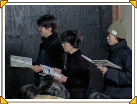 ●いよいよ「鬼の出現」です。今年は、「青鬼」と「黄鬼」と「緑鬼」が襲撃してきました。中には、怖がる小さい子もいましたが、みんな「豆」を投げつけて「鬼退治」をしました。最後には鬼も降参し、仲良く全員で写真を撮りました。