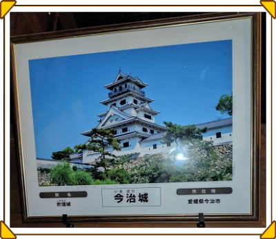 ⦿中に入ると、全国の城の写真が掲示してありました。なんとその中に、私のふるさとの城【今治城】があったので、思わずパチリとしました。この今治城は、〈藤堂高虎〉によって築かれました。お堀には、瀬戸内海の海水が引き込まれています。