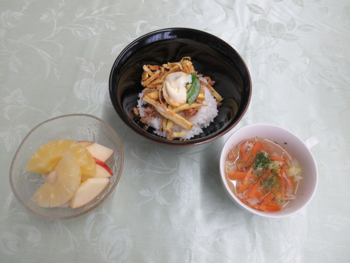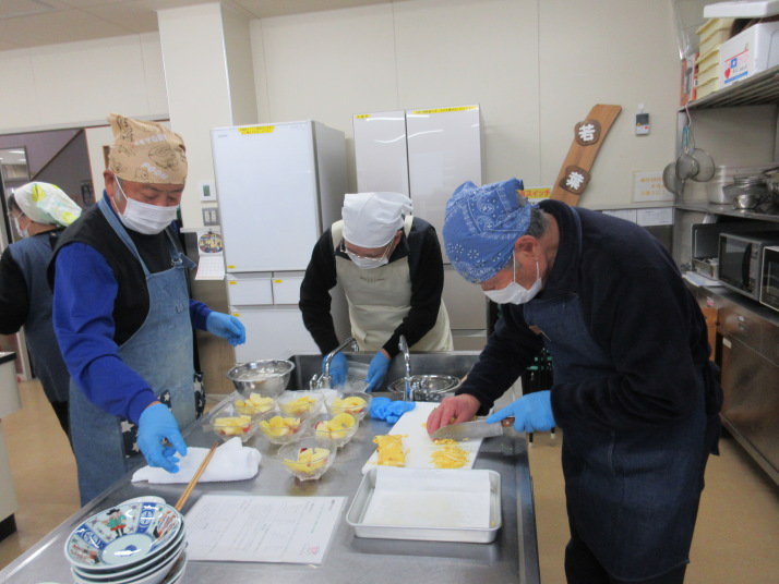 食育推進員の指導のもと、丼物、スープ、白玉団子入りのフルーツポンチを作りました。和やかな雰囲気の中楽しく学ぶことができました。