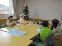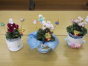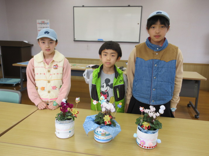 植木鉢をデコレーションし、ガーデンシクラメンを包装紙で包んでクリスマスフラワーを完成させました。