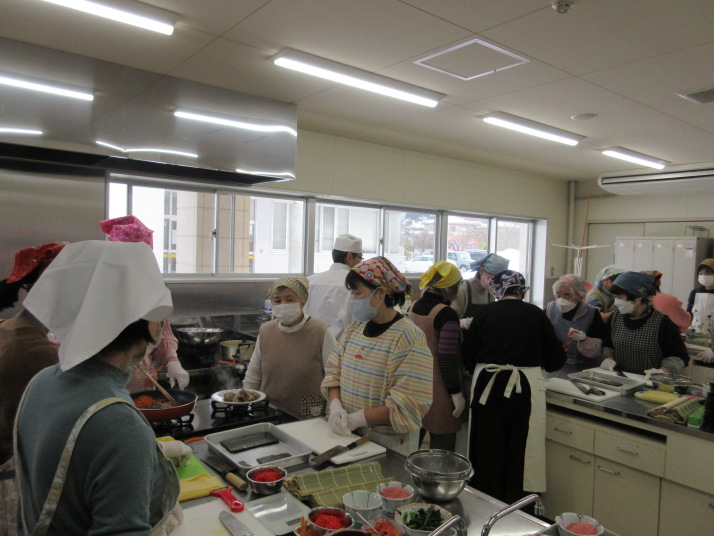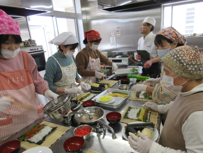 握りの頂点の先生をお招きし、太巻き、バラの花巻き、キンパ巻きの3種類の恵方巻づくりを行いました。和やかな雰囲気の中楽しく作ることができました。