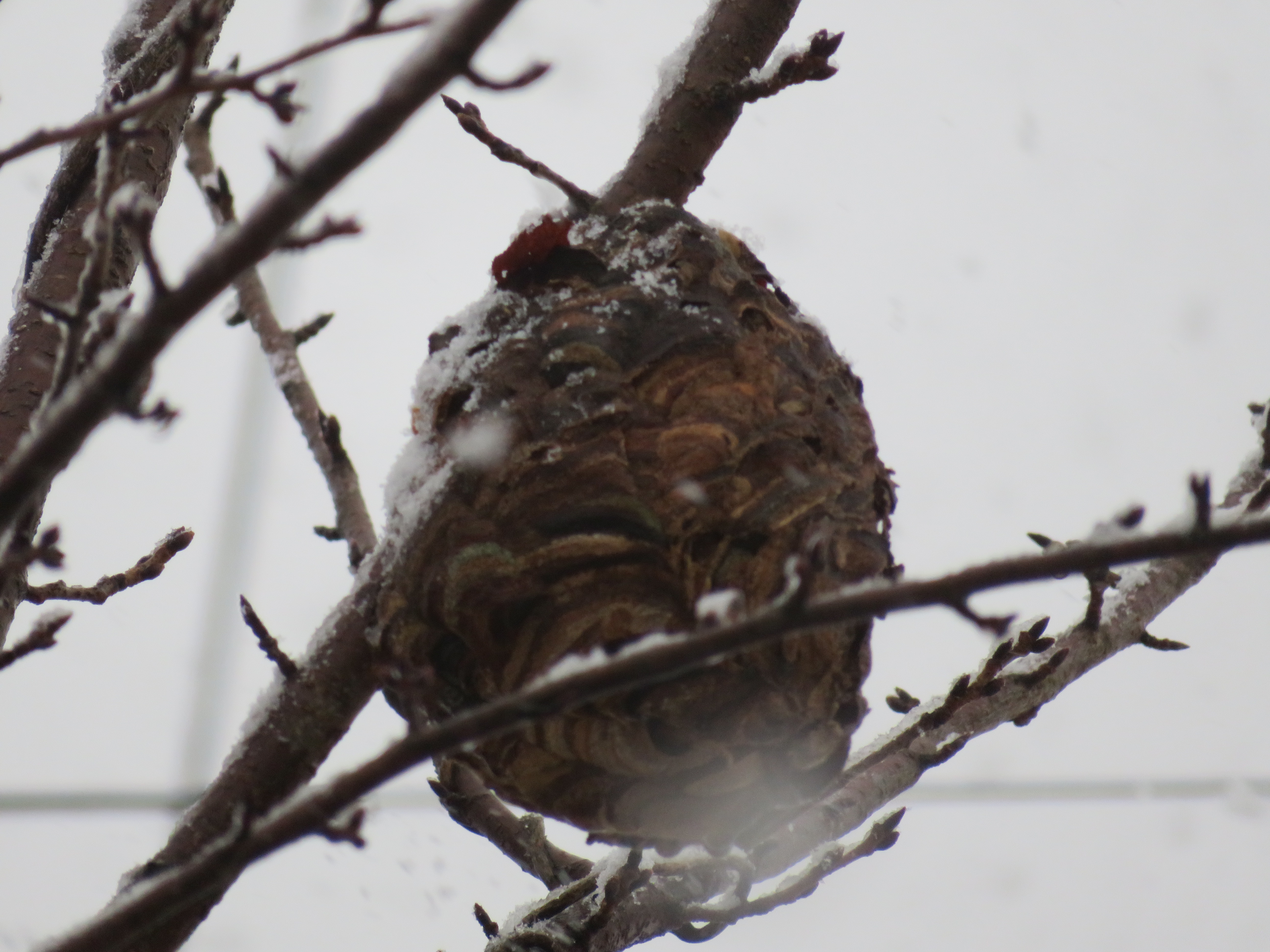 雪がチラチラと舞う朝の事。1月ももう終わりだなぁ・・・なんて思いながら公民館に出勤すると、庭木の枝(高さ3メートル程の位置)に何やら丸っこいものがありました。