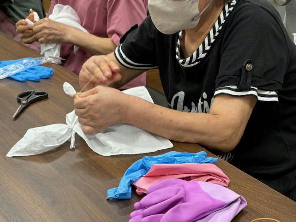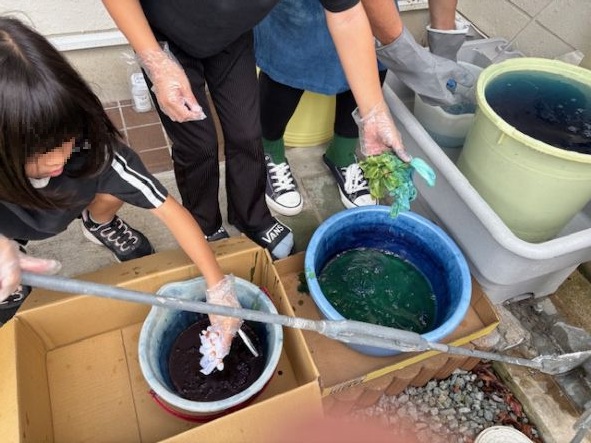 藍染め体験をしました。今回は輪ゴムやビニールテープで縛って、2色染めをしました。  1時間半くらいで出来ましたが、皆さんそれぞれにきれいな染め上りでした。
